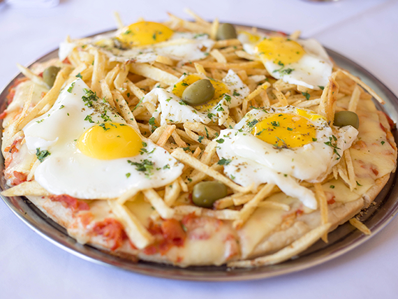 4 - CON MUZZARELLA, PAPAS FRITAS, ACEITUNAS, 4 HUEVOS FRITOS.............. $400